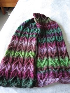 Olen penkonut lankavarastoani ja Ravelryä samalla etsien kadonnutta neulomisen iloa. Tämä huivi syntyi parissa päivässä, varastossa pyörineestä Evillan kerästä ja mallista, jota olin jo katsellut. Ja siinä se oivallus sitten oli: joskus tekemistä tärkeämpää on saada myös jotain nopeasti valmiiksi! Huivista tuli 150cm leveä ja 70 cm pitkä keskeltä; pehmensin langan karheutta uittamalla sen Serto- kylvyssä. Tästä tuli ihan kelpo huivi sohvalla lämmittelyyn.